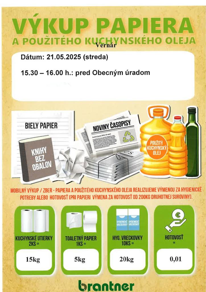 Spoločnosť Brantner oznamuje občanom, že dňa 21.5.2025 (streda) uskutoční v našej obci výkup papiera. Výkup sa uskutoční:15.30 – 16.00 h.: pred Obecným úradom.
